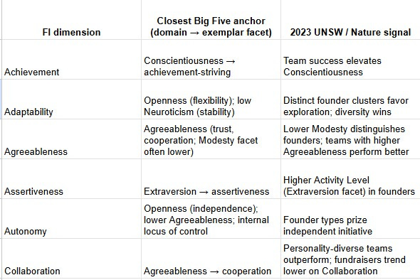 For investors: founder assessment is often intuitive and biased – and it certainly shouldn’t be when we have decades of data and research correlating personalities without comes. Seriously, what investor in their right mind would neglect having this data in place? An empirical model grounded in psychology reduces subjectivity. It provides a structured way to identify which founders are more likely to execute, which teams are complementary, and where risk mitigation is needed.