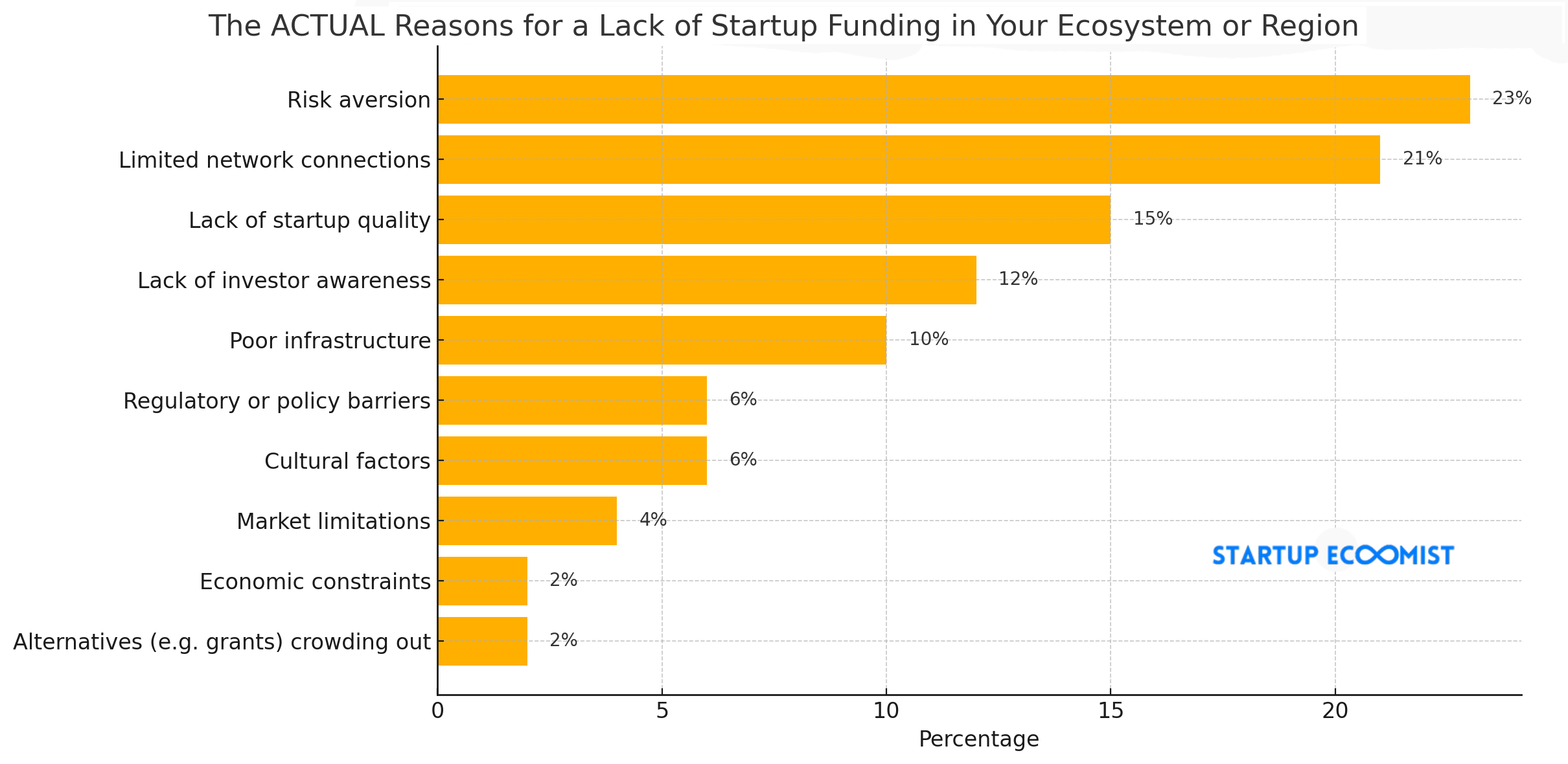 Small percentage, outsized impact. Here’s a great example because of not only the policy itself but what has happened since. In April 2024 the U.S. Federal Trade Commission finalized a national noncompete ban enabling a far more competitive job market wherein talent would also move around more, fueling innovation; nice, but, just this month they backed off the policy. Translation: not just good or bad policy but regulatory volatility causes chaos where venture capital favors stability. If your state or courts lock down mobility as has happened just now in the U.S., expect fewer spinoffs, slower knowledge diffusion, and more “we’ll just open in Silicon Valley.” We’re in the bottom 5 of reasons venture capital might avoid your ecosystem but appreciate that the survey asked the most significant cause - if you’re facing bad or inconsistent policy, to high risk investors, it isn’t worth the risk.
